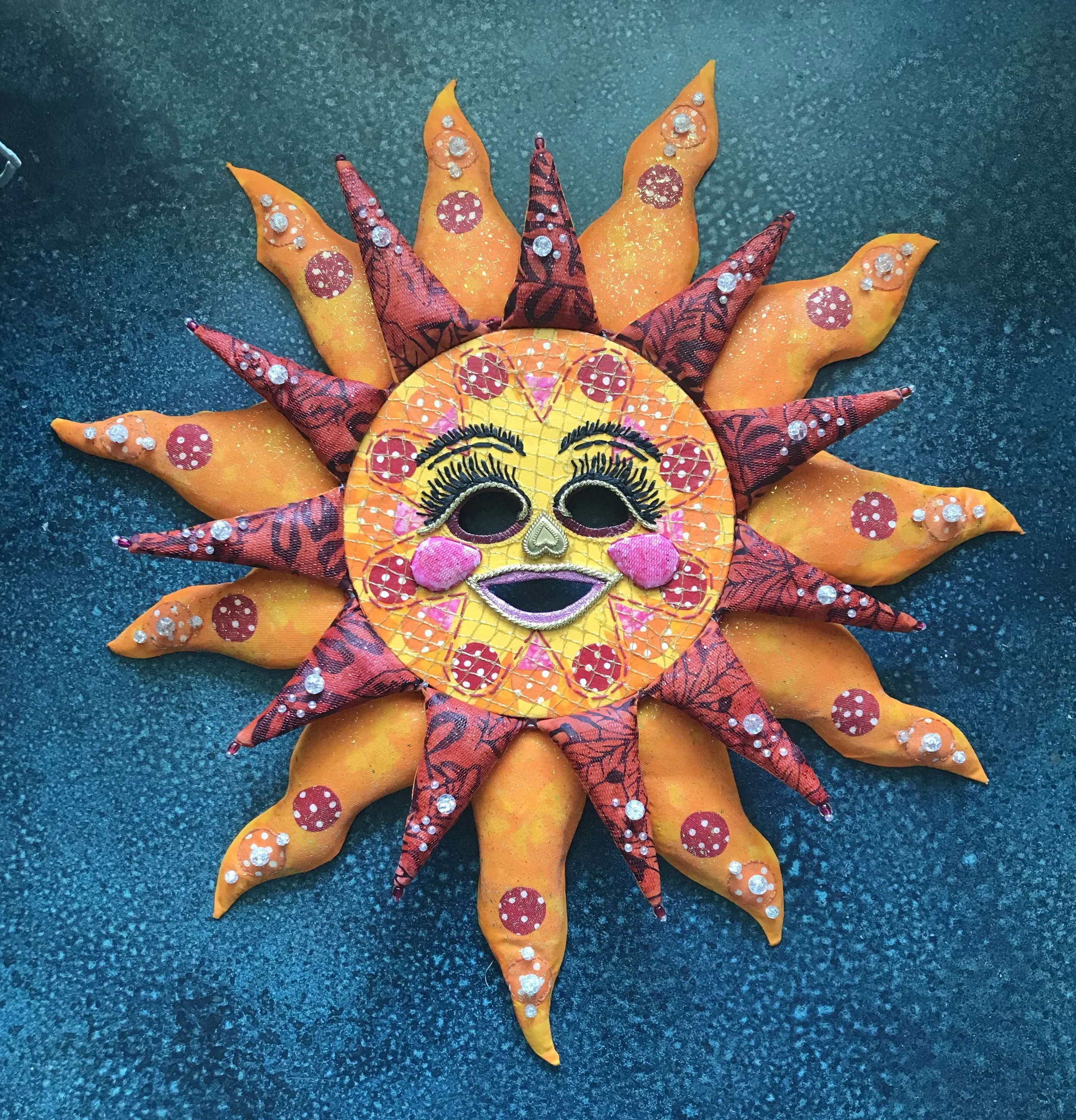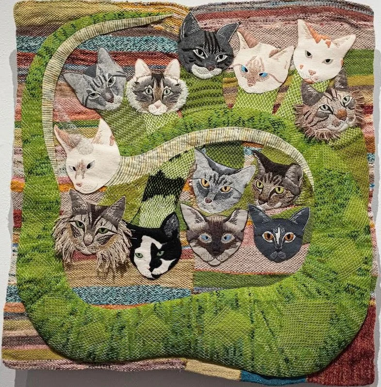 Natural and synthetic fiber: Hand stitched felt appliqué on a hand woven background